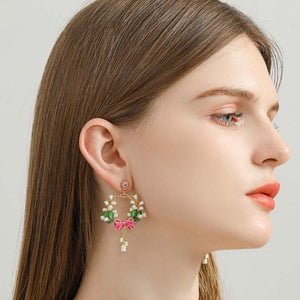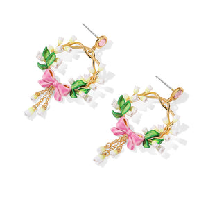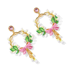These exquisite earrings feature hand-painted enamel lilies of the valley intertwined with lush green leaves, all tied together with a soft pink bow. The sparkling pink stone adds a touch of glamour, making these earrings a perfect accessory for any occasion. Embrace the beauty of nature and add a whimsical touch to your style with these beautifully crafted earrings.