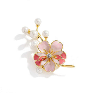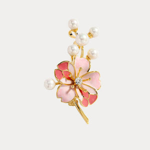This "Blossom Pearl Brooch" presents a sophisticated design combining a large, pink flower with delicate enamel petals and a sparkling central gem. This flower is elegantly set against a backdrop of lustrous pearls, arranged in a graceful curve. The gold-tone setting enhances the warmth and richness of the design, making this brooch a perfect accessory for adding a touch of refined beauty to any outfit.