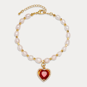 This delicate bracelet combines luminous freshwater pearls with a stunning red heart-shaped gemstone pendant, framed in glittering cubic zirconia. Perfect for adding a hint of elegance and charm to your wrist.