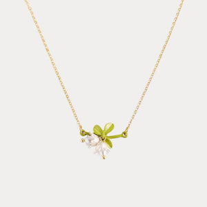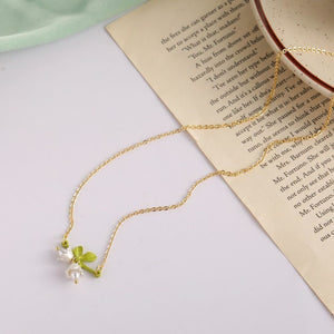Featuring the lily of the valley design, this charming flower symbolizes good luck and happiness. The golden chain enhances its elegance, making it a versatile piece to complement any look, whether casual or formal.