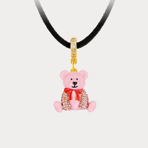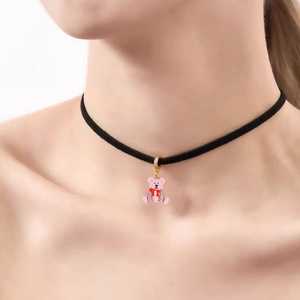 Add a sprinkle of sweetness to your look with the Candy Bear Pendant Choker. Featuring an adorable pink enamel teddy bear with sparkling crystal-studded arms and a bright red bow, this piece captures playful nostalgia in a chic design. Hung from a velvet choker, it’s a whimsical statement for those who carry joy close to heart.