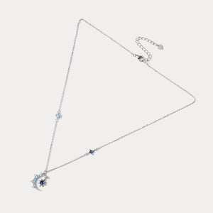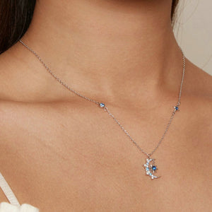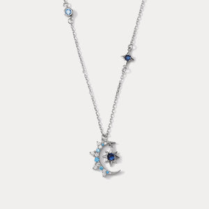 A delicate silver necklace featuring a crescent moon adorned with shimmering blue accents and an eight-pointed star pendant. A dreamy piece to capture the magic of the night sky.