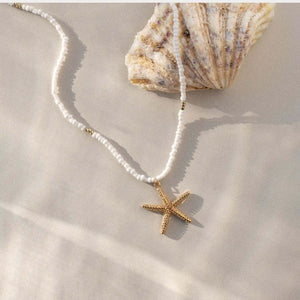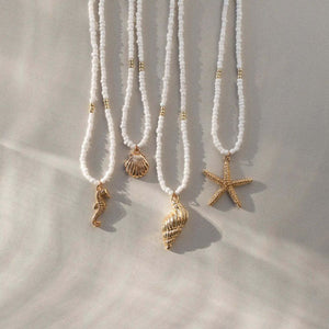 Carry the serenity of the ocean wherever you go with the Ocean Beaded Necklace. Featuring delicate white seed beads accented with shimmering gold-tone sea charms, this necklace embodies the effortless elegance of coastal beauty.