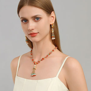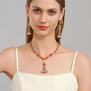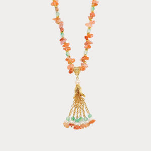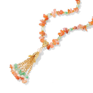 Embrace elegance with a touch of nature through the Pearl Natural Stone Tassel Necklace. Featuring a mix of peach stones, green beads, and a cascading pearl tassel, this necklace brings a chic, boho flair to any outfit.