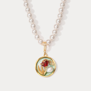 Highlighting a striking red rose pendant with golden details, this piece is framed with radiant pearls, symbolising grace and femininity. Ideal for making a bold yet elegant statement.