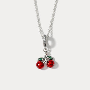The Silver Cherry Pendant Necklace captures the essence of playful elegance and charm. Crafted from fine silver, the pendant showcases two vibrant red cherries paired with lush green leaves, all accented with subtle sparkling details. A sweet and stylish accessory that adds a fresh pop of colour to any look.