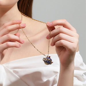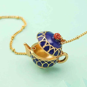 Crafted with intricate enamel detailing in deep blue and accented with gold-tone finishes, this unique pendant features a miniature teapot design that opens, evoking a sense of whimsy and curiosity. Perfect for tea lovers and those who appreciate the finer things in life.