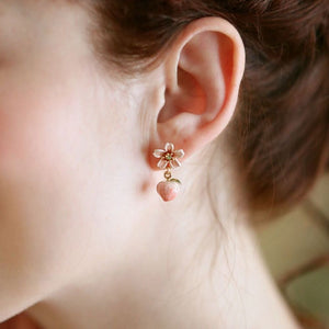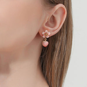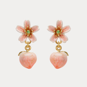 These charming earrings bring the essence of spring to life, marrying the delicate beauty of peach blossoms with the allure of peach charms. The flowers, tinged with soft pinks and set with shining stone centers, hang elegantly above the enamelled peaches, which mimic the warmth and sweetness of the season.