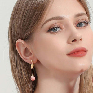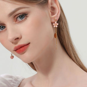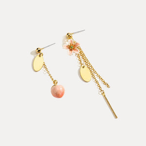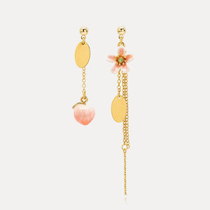 Elegance and whimsy unite in these asymmetrical earrings, where one earring showcases a delicate peach charm, while its pair cascades with a chain linked to a floral adornment, adding a dynamic touch to any ensemble.