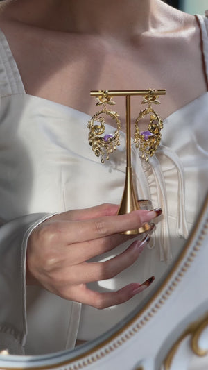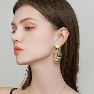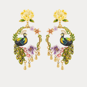 Introducing the Enchanted Peacock Earrings, a stunning blend of elegance and whimsy. These exquisite earrings feature a vibrant peacock, intricately hand-enameled in rich hues, perched amidst blooming flowers. Adorned with delicate golden droplets, these earrings are a celebration of nature's beauty and artistry. Perfect for special occasions or adding a touch of magic to your everyday look.