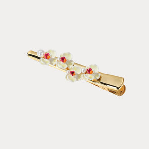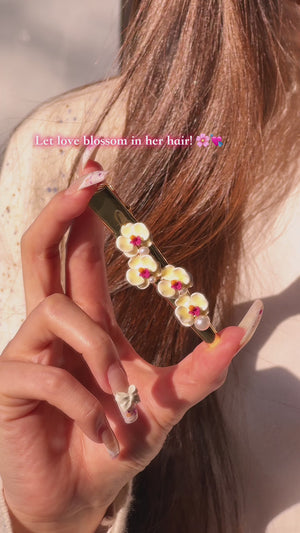 This elegant accessory features delicate phalaenopsis flowers crafted with intricate enamel detailing, accented by a single pearl for a touch of sophistication. Perfect for special occasions or to add a floral charm to your everyday look.