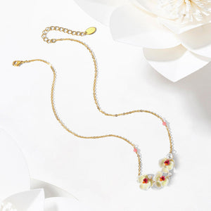 Prepare for all the admiration and compliments with our Phalaenopsis Orchid Necklace. This stunning piece is crafted from hand-enameled brass, featuring vibrant phalaenopsis orchids in full bloom. A lustrous pearl adds an elegant touch, enhancing its bucolic charm. This necklace is the perfect blend of natural beauty and sophisticated design, making it an exquisite addition to any outfit.