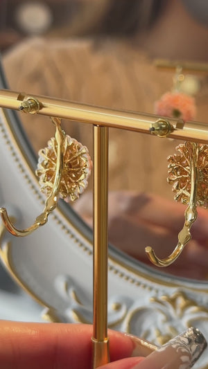 Enhance your jewelry collection with these stunning Pink Verbena Hoops Earrings. Each hoop is adorned with delicate pink verbena flowers, intricately crafted to showcase their natural beauty. The vibrant blossoms are set on a graceful gold hoop, creating a striking balance between elegance and charm.