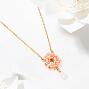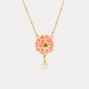 Adorn your neck with the enchanting Pink Verbena Necklace. This exquisite piece features a cluster of hand-enameled pink verbena flowers delicately suspended from a golden chain, accompanied by a lustrous pearl drop. Its intricate design captures the essence of natural beauty.