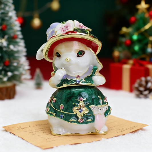 Featuring a cheerful white bunny adorned with a pink bow, perched atop a sunflower-patterned base, this delicate piece is both a decorative item and a functional storage solution. The hinged design opens to reveal a small compartment, ideal for storing jewelry or other tiny treasures. Crafted with exquisite details and vibrant colors, this trinket box is a delightful addition to your collection or a perfect gift for bunny lovers and sunflower enthusiasts alike.
