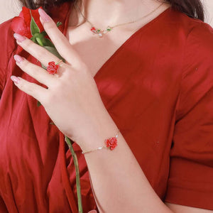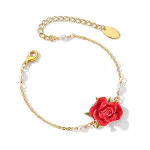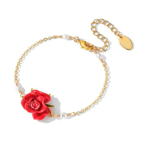 This exquisite piece features a beautifully enamelled red rose centerpiece that symbolizes love and passion, surrounded by delicate green leaves. The gold-plated chain is adorned with lustrous pearls, adding a touch of sophistication and timeless beauty. Perfect for any occasion, this bracelet is a stylish and romantic accessory that will elevate any outfit. Whether as a gift or a personal treat, it’s a must-have addition to your jewelry collection.
