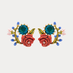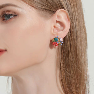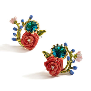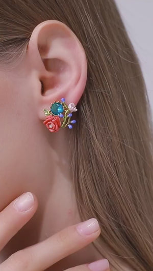 Crafted with intricate enamel detailing, each earring features a vibrant red rose, symbolizing love and passion. Adorned with a sparkling green stones and delicate blue and pink floral accents, these earrings offer a harmonious blend of elegance and charm.