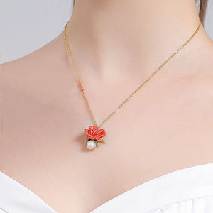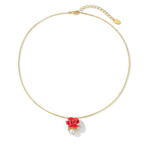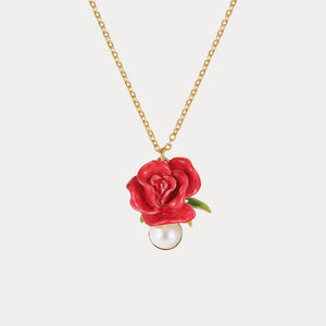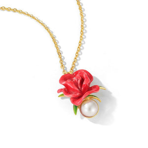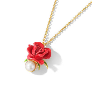 Crafted with meticulous attention to detail, the necklace features a vibrant red enamel rose that symbolizes love and passion. The rose is complemented by a lustrous pearl, adding a touch of timeless sophistication. The pendant hangs gracefully from a delicate gold-plated chain, making it a versatile piece for both everyday wear and special occasions.