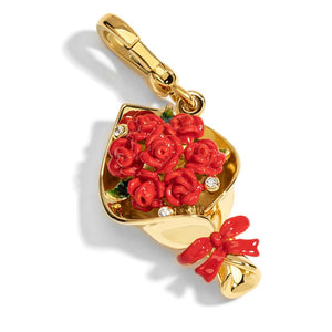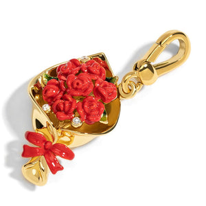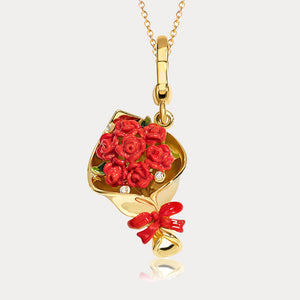 Crafted from high-quality materials, this pendant features a bouquet of vibrant red roses encased in a gold-plated setting, accented with delicate enamel and sparkling crystals. The intricate design is completed with a charming bow, adding a touch of elegance and sophistication. Whether as a gift for a loved one or a treat for yourself, this pendant is sure to make a stunning statement and become a treasured favorite.
