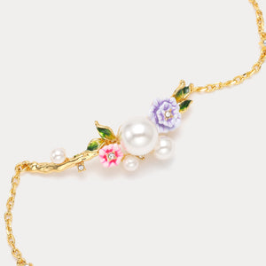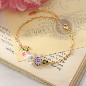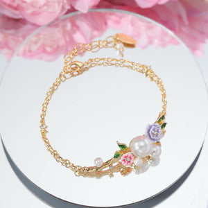 A charming blend of handcrafted flowers, shimmering pearls, and intricate golden detailing. The vibrant pink and purple roses bring a touch of romance, while the sparkling crystals add an extra dash of elegance. This bracelet is a celebration of nature's artistry, designed to complement your unique style.