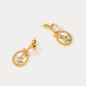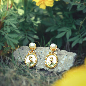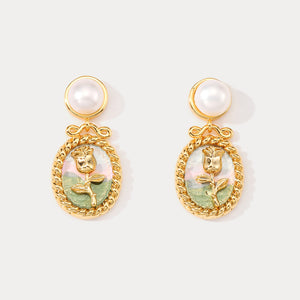 The Wild Rose Oil Painting Earrings radiate sophistication with their intricate rose design set against a luminous backdrop. These dangling earrings are framed by a braided gold-tone border and adorned with pearl accents, making them an exquisite choice for both casual and formal occasions.