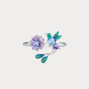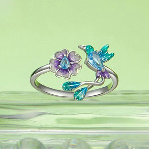 The Bird Blossom Ring features a colourful hummingbird mid-flight, reaching for a blooming violet flower. Hand-painted in vivid hues and accented with teardrop-shaped crystals, this sterling silver open ring captures a moment of pure harmony and grace. Whimsical yet elegant, it’s the perfect piece for free spirits and nature lovers.