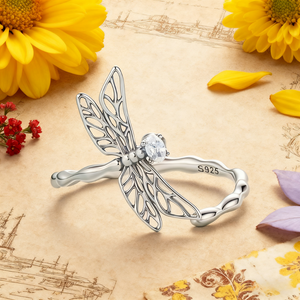 Crafted from 925 sterling silver, the Dragonfly Ring showcases an intricate open-wing design accented with a sparkling crystal at its centre. The textured band enhances its natural elegance, while the dragonfly symbolises transformation and light. A delicate yet striking piece for lovers of nature-inspired jewellery.