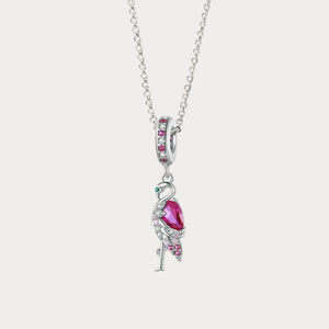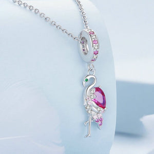 The Flamingo Pendant Necklace features a beautifully sculpted flamingo adorned with shimmering white and pink crystals, and a vibrant heart-shaped ruby-red stone at its centre. Set on a sparkling bail and silver chain, this piece embodies elegance, playfulness, and confidence—just like the bird it represents.