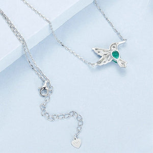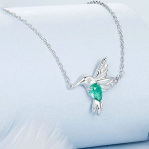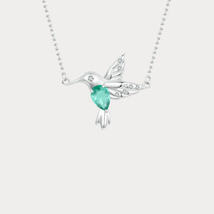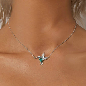 The Hummingbird Necklace features a graceful silver hummingbird mid-flight, accented with sparkling crystals and a vivid green heart-shaped gemstone at its center. Symbolizing joy, freedom, and lightness of spirit, this necklace captures the magic of nature in every detail. A perfect piece to wear close to your heart—radiant, meaningful, and effortlessly elegant.