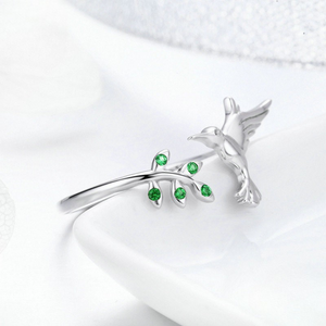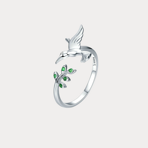 Crafted from genuine 925 sterling silver, this Hummingbird Ring features a delicate hummingbird in mid-flight, reaching for a sparkling branch adorned with vivid green crystals. The open design adds a modern touch while ensuring a comfortable, adjustable fit. Inspired by nature’s quiet beauty, this piece brings a serene and uplifting charm to your everyday look.