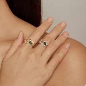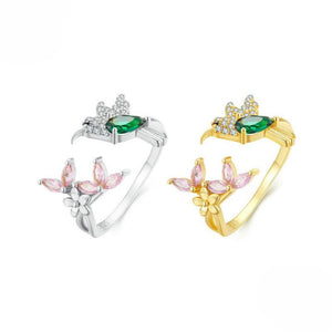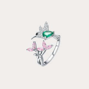 The Hummingbird Ring features a graceful hummingbird reaching toward a blooming flower, symbolizing energy, joy, and renewal. Adorned with sparkling pavé crystals, a vivid green stone, and delicate pink petals, this adjustable ring is available in both silver and gold finishes. A stunning tribute to nature’s most enchanting messenger, perfect for adding a touch of elegance and wonder to your everyday look.