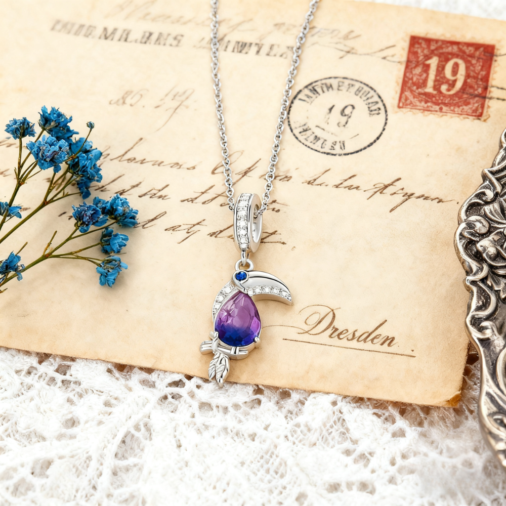 Bold and vibrant, the Toucan Pendant Necklace is crafted from 925 sterling silver and adorned with sparkling crystal accents. Its pear-shaped gemstone in radiant shades of purple and blue brings the exotic bird to life, symbolising playfulness and tropical charm. A captivating piece that adds colour and personality to your jewellery collection.