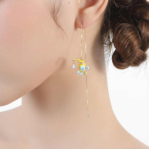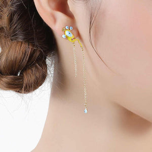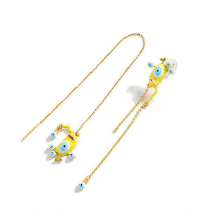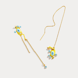 Featuring mismatched designs, one earring showcases a bright yellow monster adorned with cute blue eyes, while the other boasts a delicate threader chain with the same charming motif.