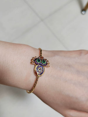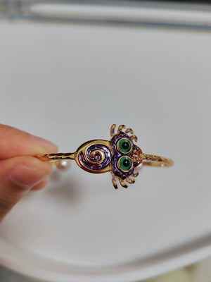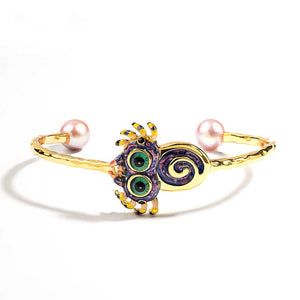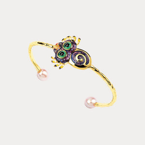 Featuring a detailed spider motif with mesmerizing green eyes and a spiraled body, this bracelet is a captivating accessory that balances quirky and chic. The vibrant enamel detailing and polished gold-tone finish make it a standout piece. Accentuated by elegant pink pearl tips on each end, this bracelet effortlessly combines whimsical design with a modern, sophisticated twist.
