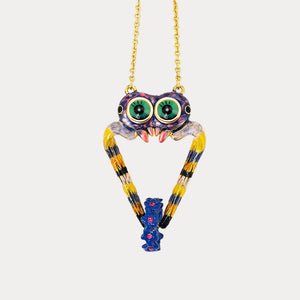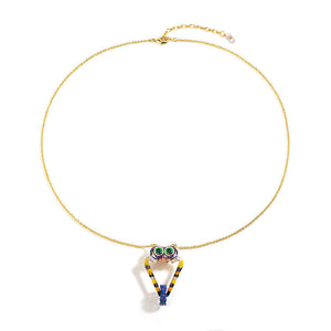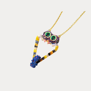 Featuring a bold spider pendant with striking, large green eyes and intricately detailed legs, this statement piece is sure to captivate attention. The vibrant yellow, blue, and black enamel finish adds a pop of color, while the unique design brings a playful yet edgy charm to your outfit. Perfect for those who love quirky and adventurous accessories.