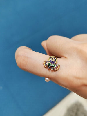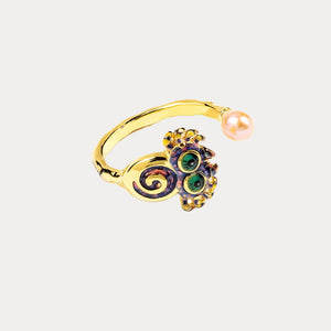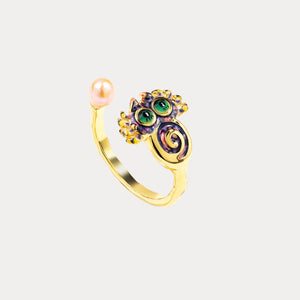 The spider’s eyes are vividly captured in rich green hues, adding a touch of curiosity and fun. The golden band elegantly wraps around the finger, and a delicate pearl accent adds a sophisticated flair to this quirky piece. Perfect for those who enjoy bold, unique accessories.