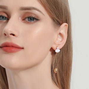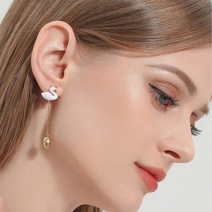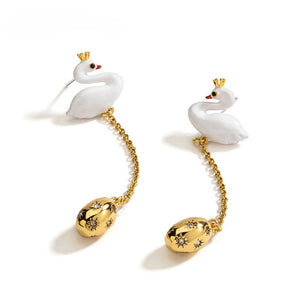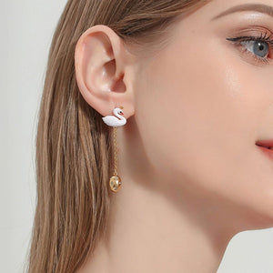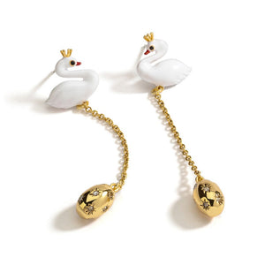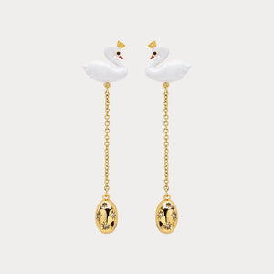 Grace your ears with the elegance of the Swan Drop Earrings. Featuring royal swans crowned in gold, suspended from a delicate gold-tone chain with intricate floral detailing, these earrings bring a touch of regal charm and sophistication to any look.