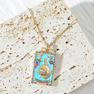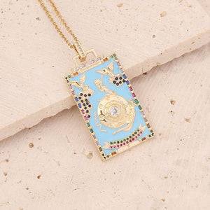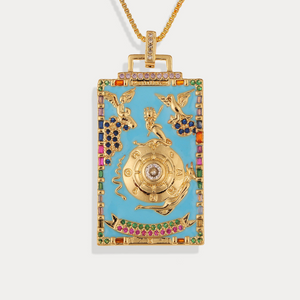 Embrace the ever-turning cycles of fate with the Tarot Card Necklace - Wheel of Fortune. This stunning pendant symbolises destiny, luck, and transformation, reminding you that life’s journey is filled with endless possibilities. Accented with multicoloured gemstones, it’s a bold statement of change and opportunity.