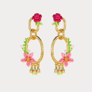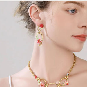 Add a burst of color and charm to your look with the Tropical Blossom Dangle Earrings! These stunning earrings feature intricate hand-painted enamel flowers in vibrant shades of pink and red, complemented by delicate greenery accents. The gold-tone hoops and dangling floral charms create a playful yet elegant design, making them the perfect statement piece for any occasion.