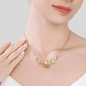 This Tropical Blossom Necklace beautifully showcases an array of garden delights. This charming piece features pink and purple flowers alongside green leaf accents, all intricately painted to highlight their delicate details. Between the floral motifs, colorful fruit-shaped charms add a playful twist, while petite house pendants dangle gracefully, invoking a storybook charm.