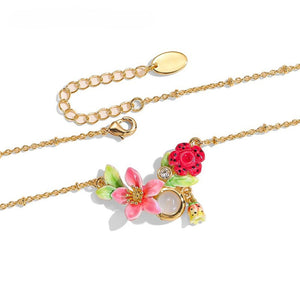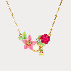 Capture the essence of a blooming garden with the Tropical Blossom Necklace. This enchanting piece features vibrant hand-painted flowers, including a delicate pink bloom and a striking red blossom, all beautifully set in a golden frame. The lively design evokes the carefree spirit of a tropical paradise, making it the perfect accessory to add a touch of freshness and joy to your look.