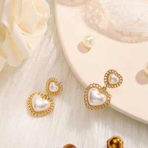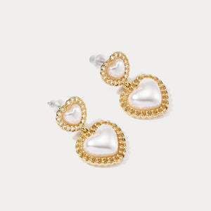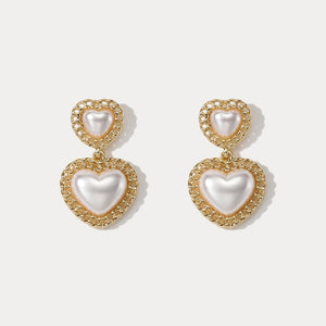 Each earring showcases double heart-shaped frames, adorned with luminous pearls that exude timeless beauty. Perfect for adding a romantic touch to both casual and formal wear.