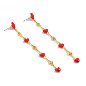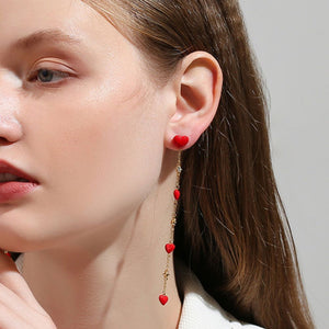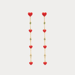 Add a pop of love and colour with the Red Heart Drop Earrings. Featuring vibrant red hearts suspended by delicate gold-tone chains and accented with sparkling stones, these earrings bring a playful yet elegant touch to any outfit.
