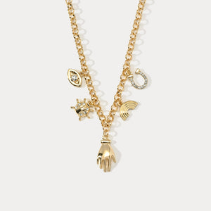 Unlock the magic of protection with our Talisman Necklace. Crafted with symbolic charms including a horseshoe, hand, rainbow, ladybug, and evil eye, this powerful piece is designed to shield you from negativity while adding a bold touch to your look. Wear it as a statement of style—and a symbol of strength, luck, and good energy.