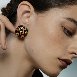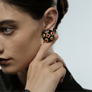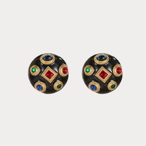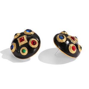 Make a bold statement with these Vintage Gem Dome Earrings, featuring a glossy black enamel dome adorned with richly colored faux gemstones framed in gold. The dimensional silhouette and regal design exude old-world glamour, perfect for elevating both everyday ensembles and special occasion looks. A striking blend of vintage charm and modern confidence.