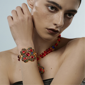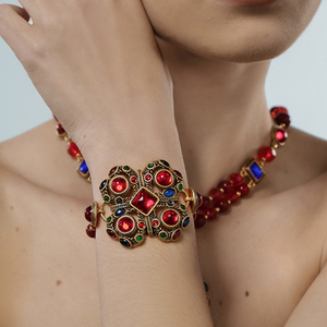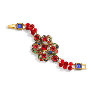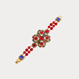 Infuse your look with regal opulence with this Vintage Scarlet Charm Bracelet. Featuring a bold cross-shaped centrepiece adorned with deep red, blue, green, and pink gemstones, this gold-tone bracelet is a tribute to vintage grandeur. Paired with vibrant beaded strands and striking enamel accents, it’s a statement piece that brings timeless elegance to any ensemble.