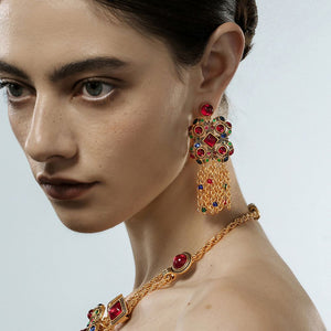 Step into old-world glamour with these Vintage Scarlet Charm Tassel Earrings. Featuring a bold cross-shaped design adorned with red, green, blue, and pink gemstones, each earring cascades into shimmering gold-tone tassels dotted with colourful accents. A statement piece that blends regal charm with playful movement — perfect for evenings that call for unforgettable style.