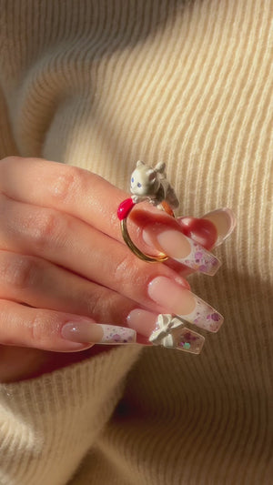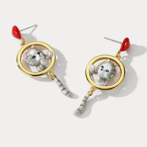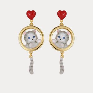 Featuring a lovely American Shorthair cat with striking blue eyes, crouched within a golden-plated brass circle, these earrings are truly enchanting, especially for cat lovers. The red hearts add an extra touch of emotional charm, making them perfect for enhancing any outfit.