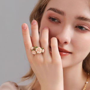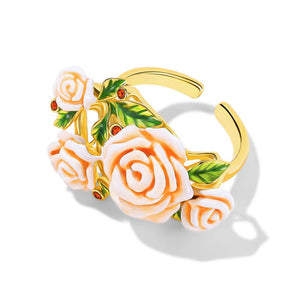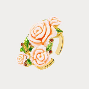Wrap your finger in the beauty of a blooming garden. The Champagne Rose Flower Ring features a cluster of hand-painted champagne roses surrounded by delicate green leaves and sparkling accents, all set on a lustrous gold-tone band. Each petal and leaf is crafted with exquisite detail, capturing the soft romance and timeless charm of a flourishing rose garden. With its adjustable open band, this ring offers both comfort and a perfect fit.