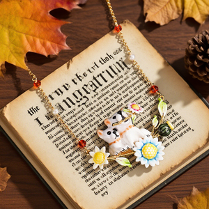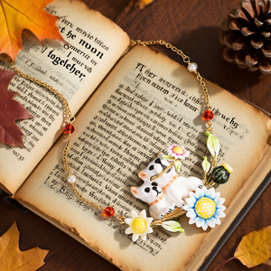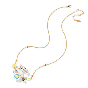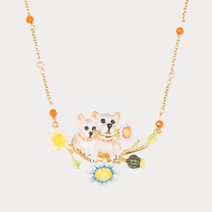 Celebrate playful charm with this Dog Daisy Necklace. Featuring two adorable pups nestled among vibrant daisies and delicate green leaves, this piece blends hand-painted enamel artistry with gold-tone elegance. The chain is adorned with pearls and red crystal accents, adding sparkle and sophistication. A perfect statement piece for dog lovers and those who adore whimsical, nature-inspired jewellery.